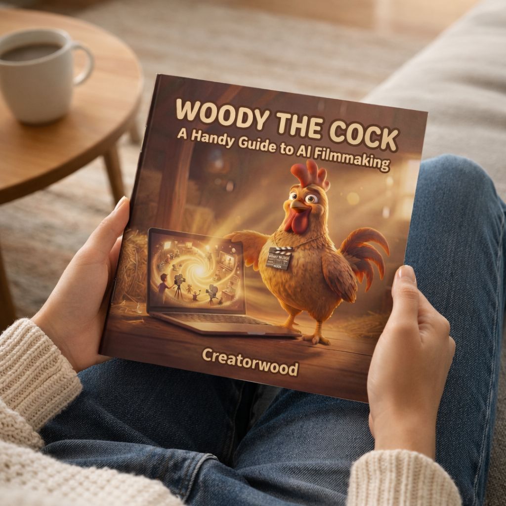 Woody the Cock is a fully illustrated picture book for grown-ups that walks you through the exact foundations of AI filmmaking using the Movie Machine. Every page is a real lesson. Every lesson is genuinely useful. The delivery mechanism is a proud plump rooster with a director's clapperboard and absolutely zero self-doubt.
